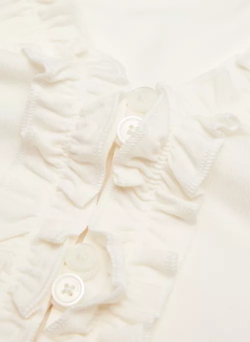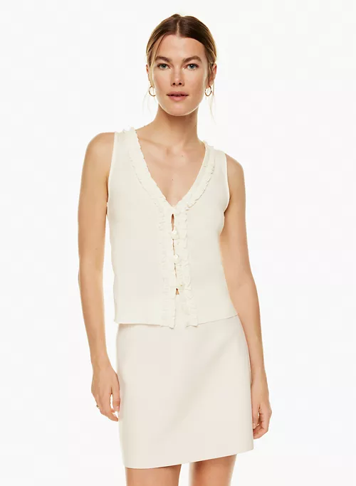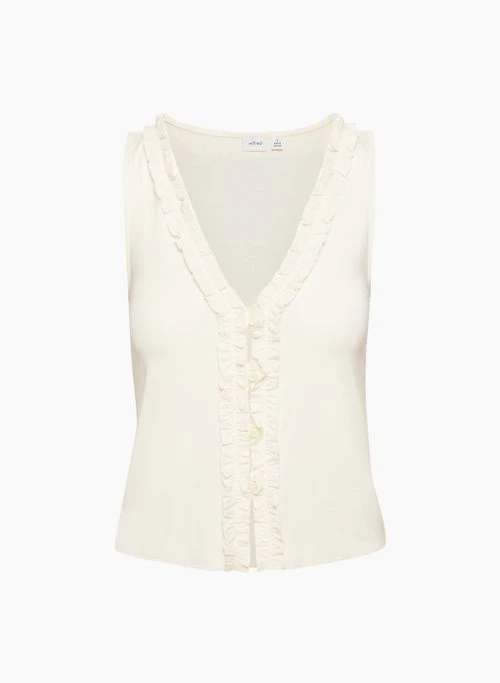 This is a V-neck tank top with ruffle details. Itās made with Relux Jersey, an ultra-soft and drapey fabric that uses TENCEL⢠Lyocell ā responsibly sourced wood-based fibres produced through a closed-loop system that reduces environmental impact.
