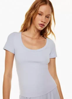 This is a crew-neck t-shirt with dolman sleeves and cuffed hems. It’s made with soft, 100% combed cotton jersey.